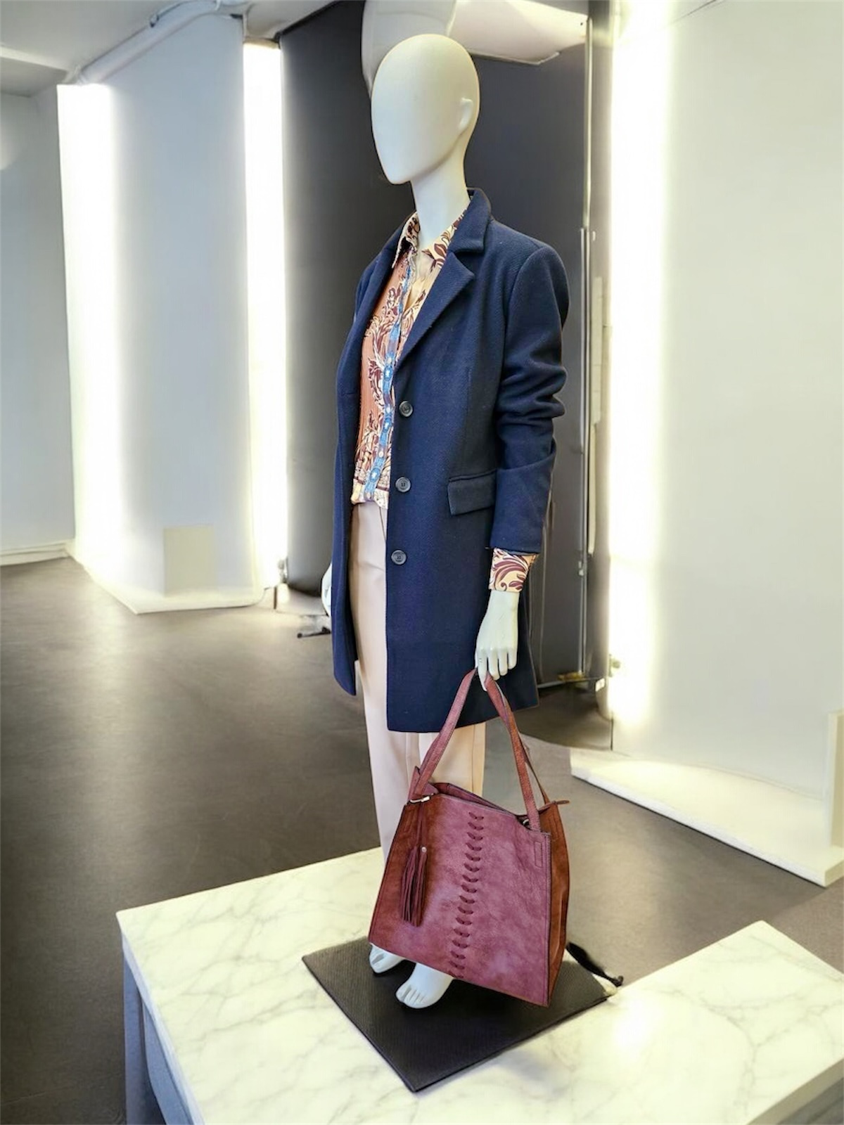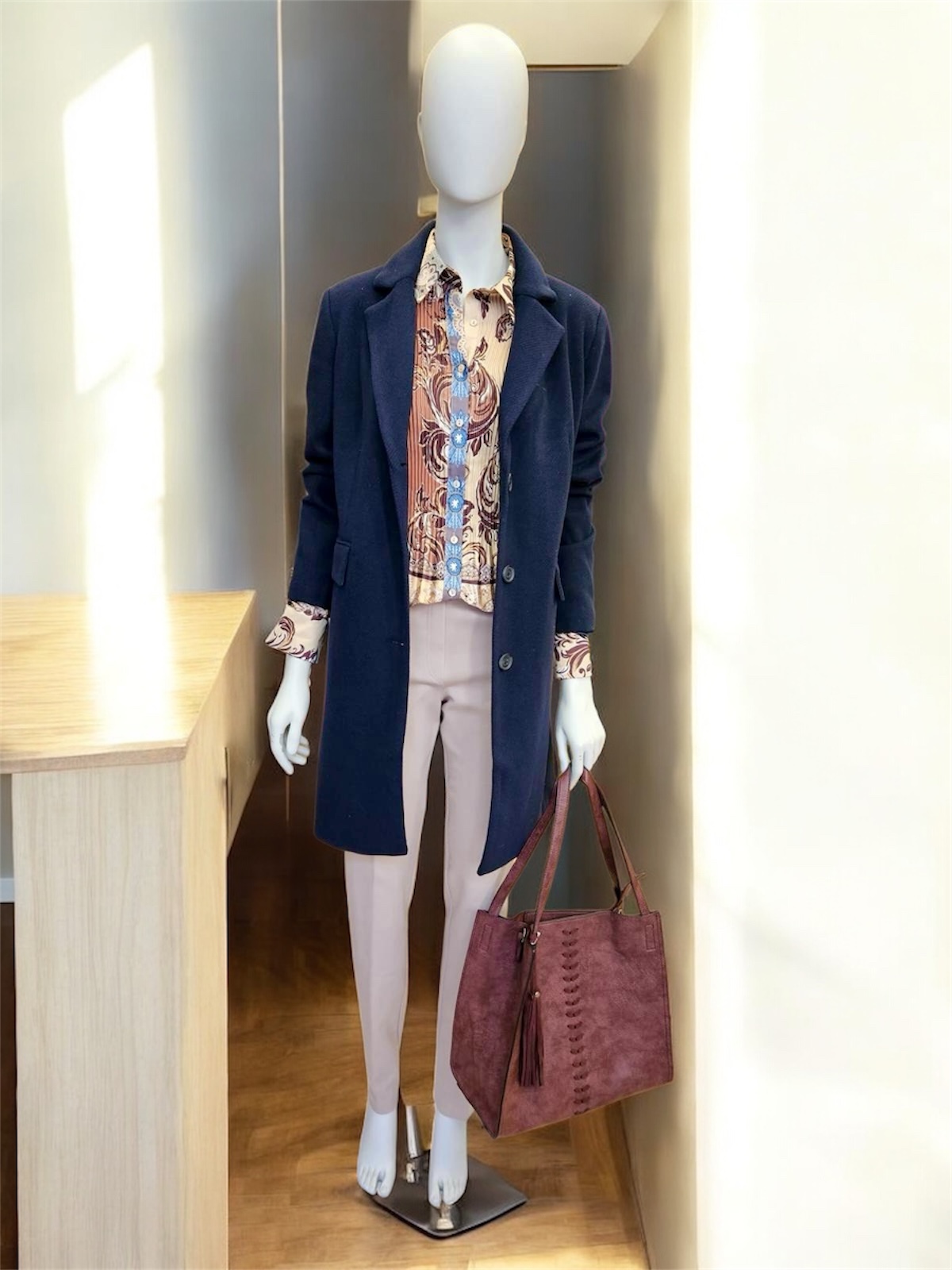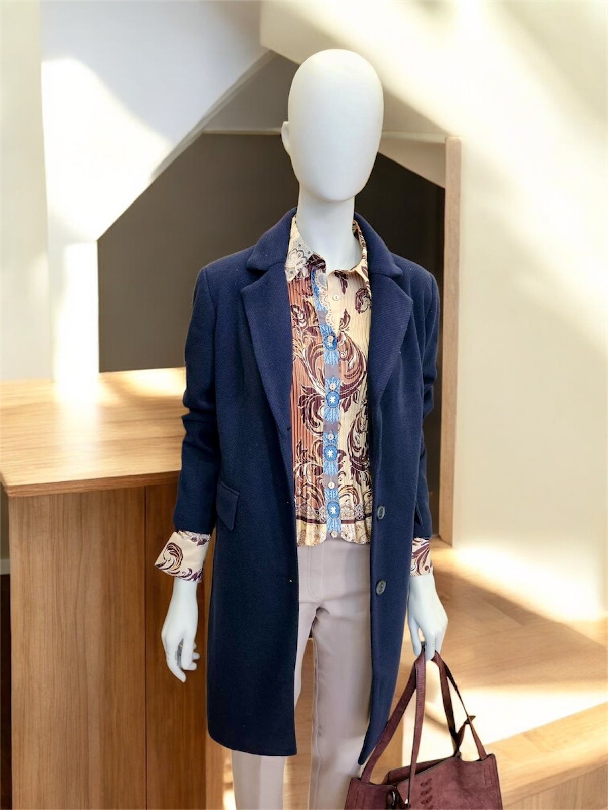 Abrigo clásico con botones nacarados delanteros y dos bolsillos.