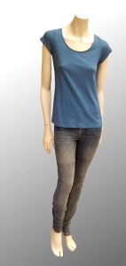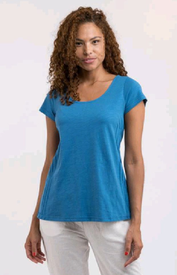 Camiseta básica azul con cuello redondo y detalle de costuras laterales.