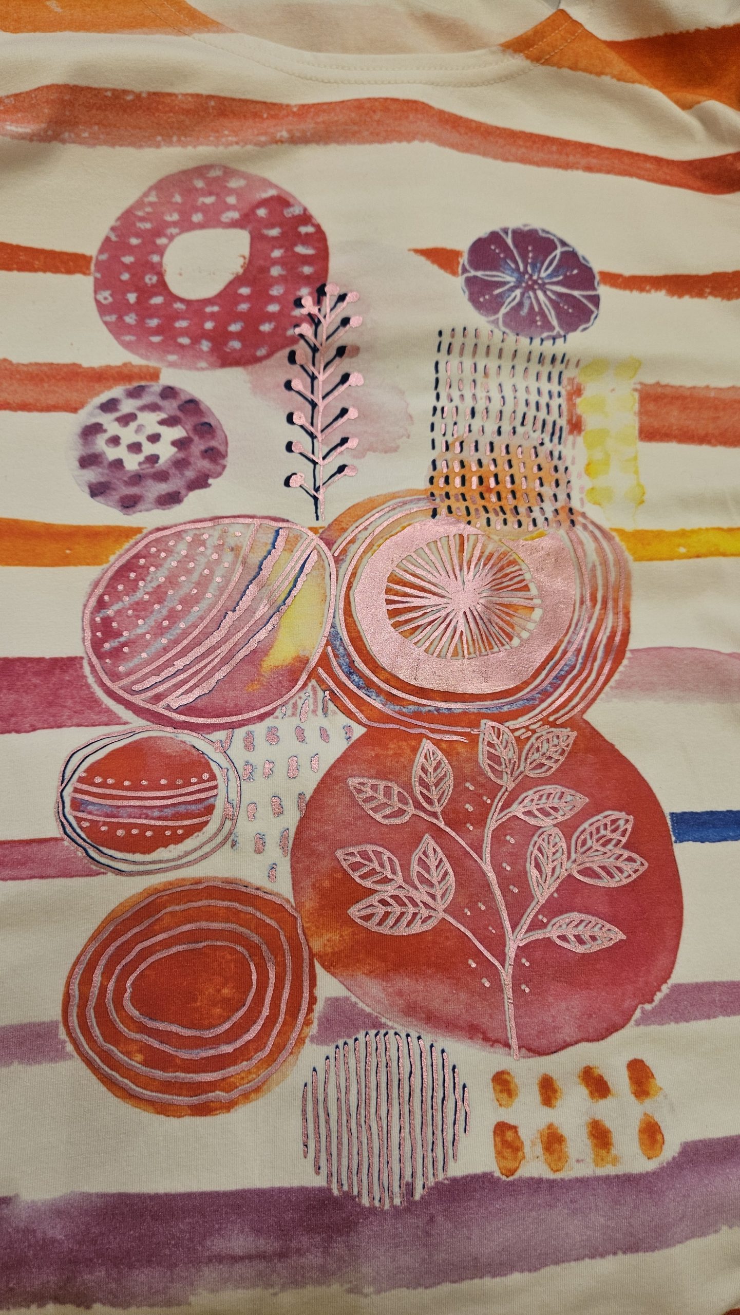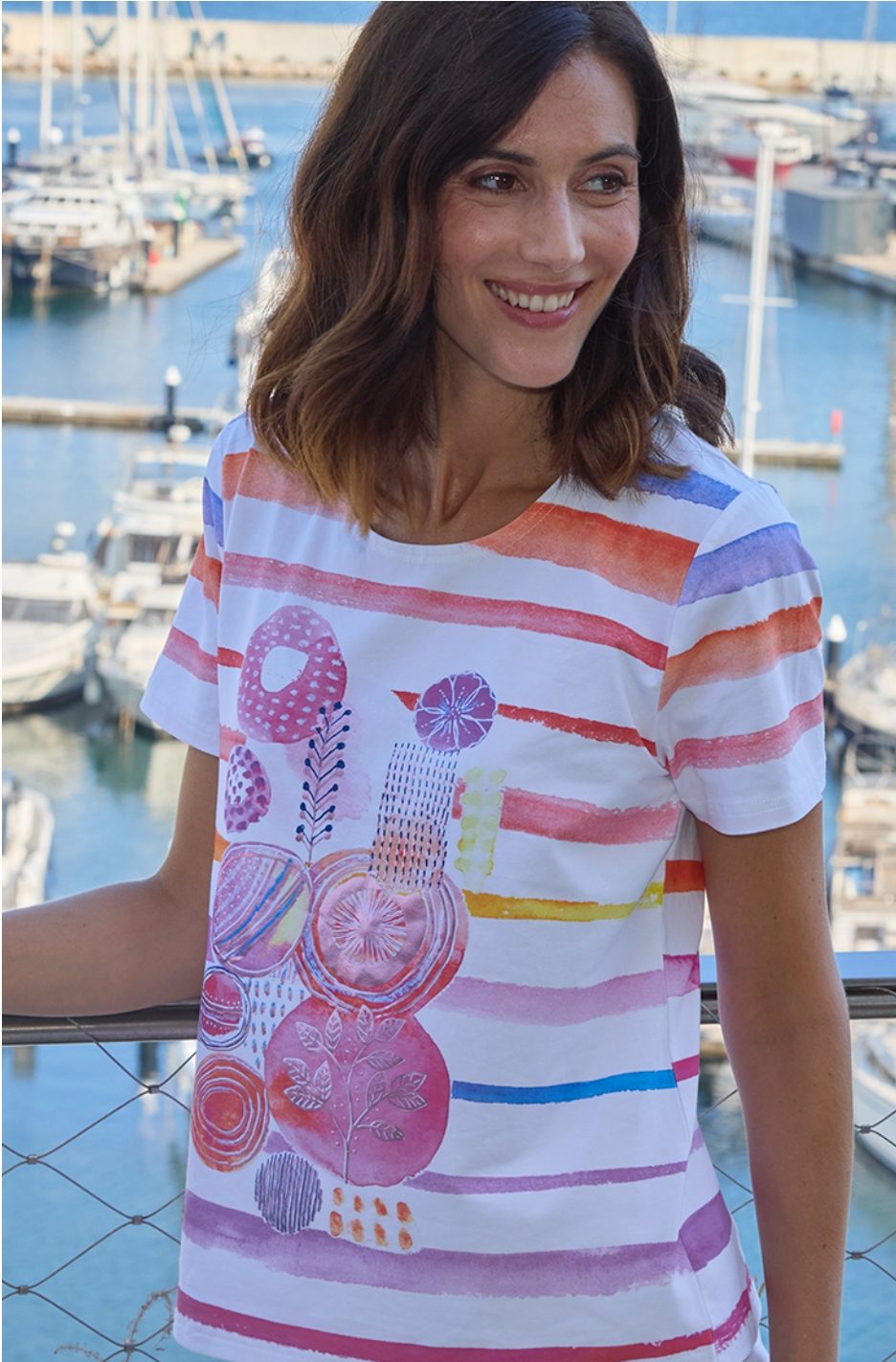 Camiseta alegre y colorida, de manga corta y cuello redondo.
