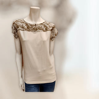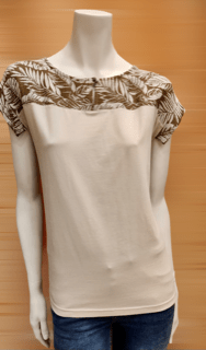 Camisetacolor crudo con estampado de palmeras en hombros. Composición: 48% Algodón, 48% Modal, 4% Elastano. Lavado a 30º.