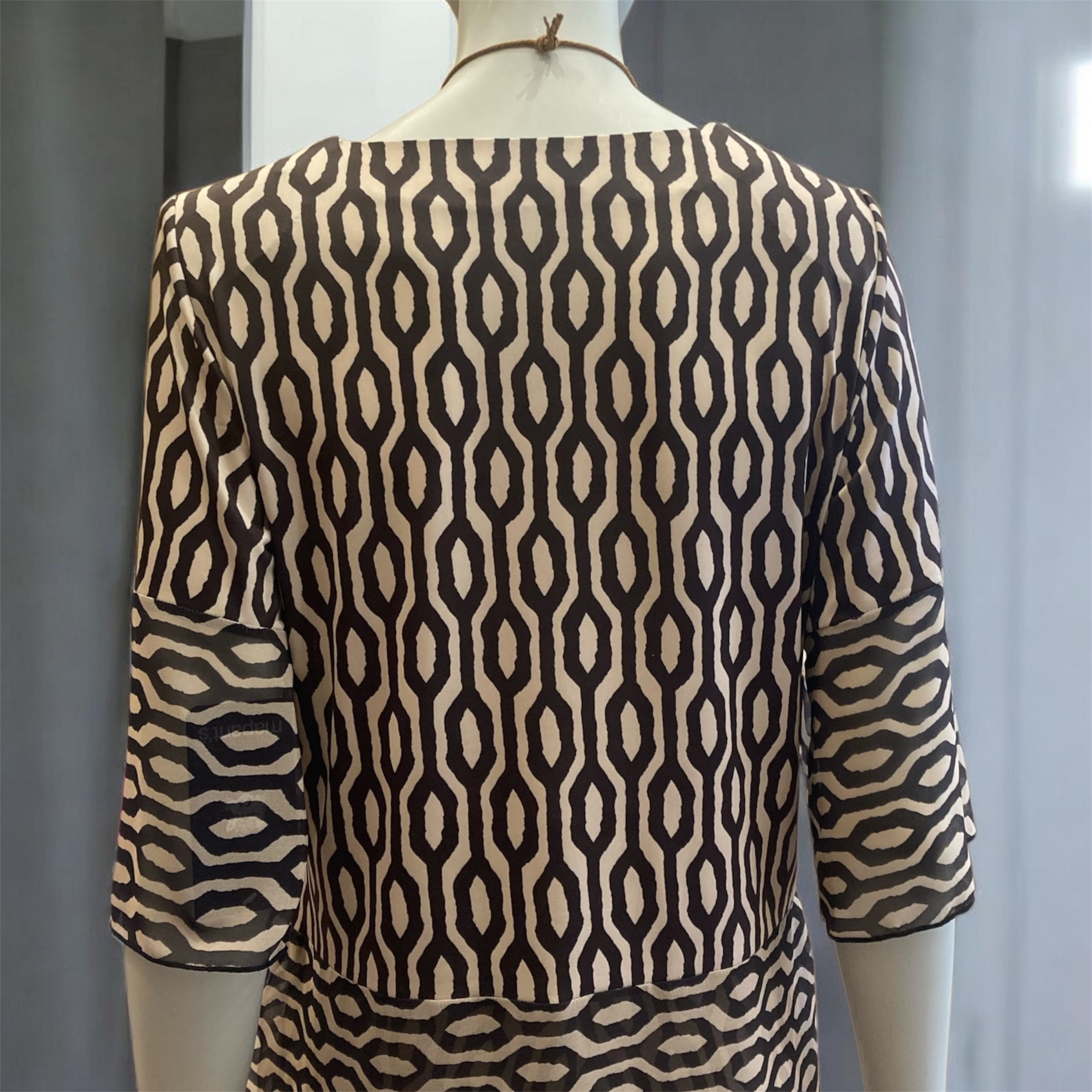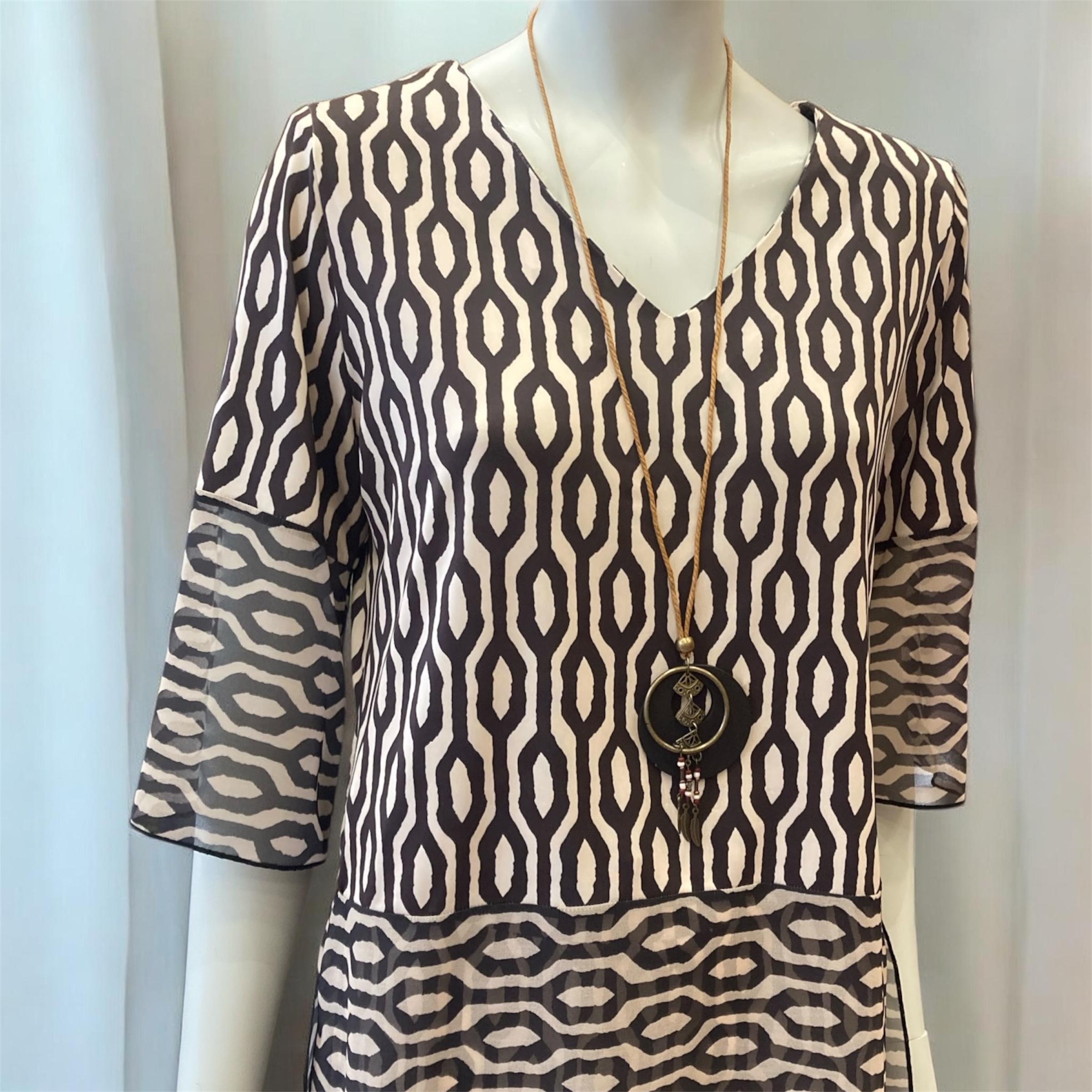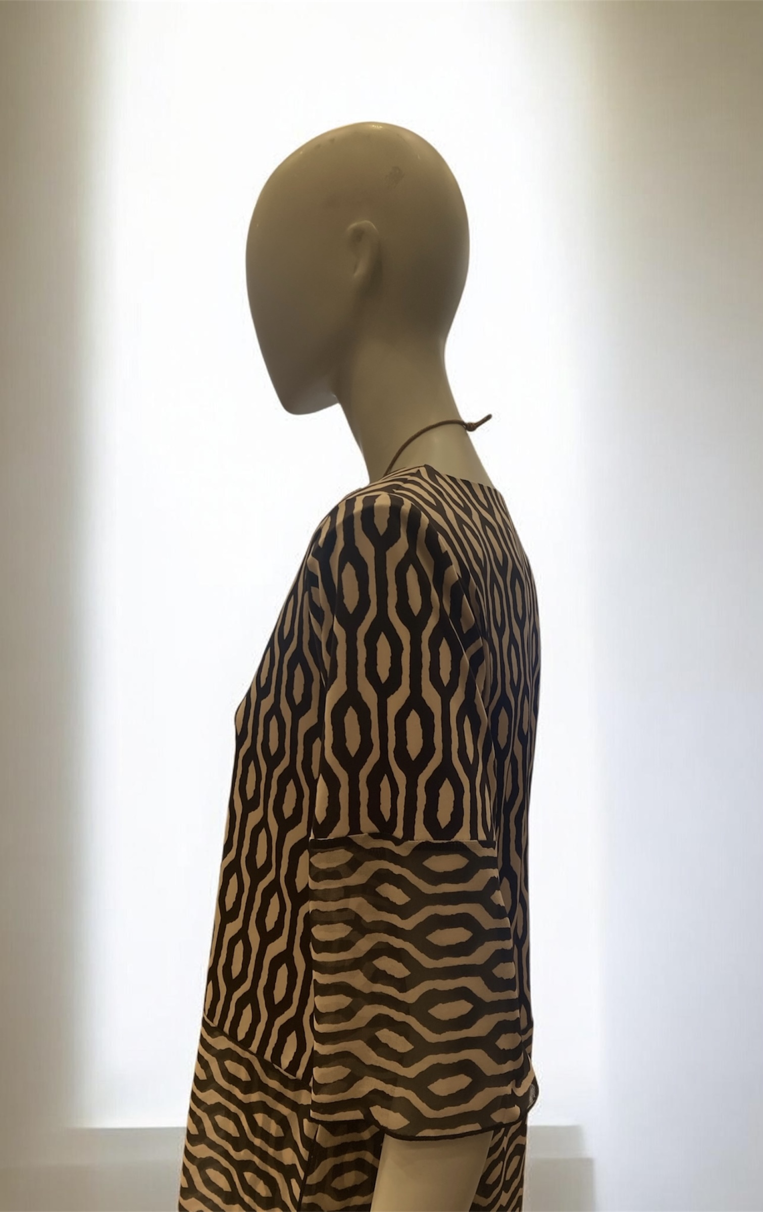 Casaca fluida con collar a juego en tono marrón y amarillo, manga francesa y hombreras.Tejido mas vaporoso en bajo y parte posterior de las mangas.
