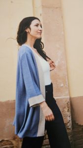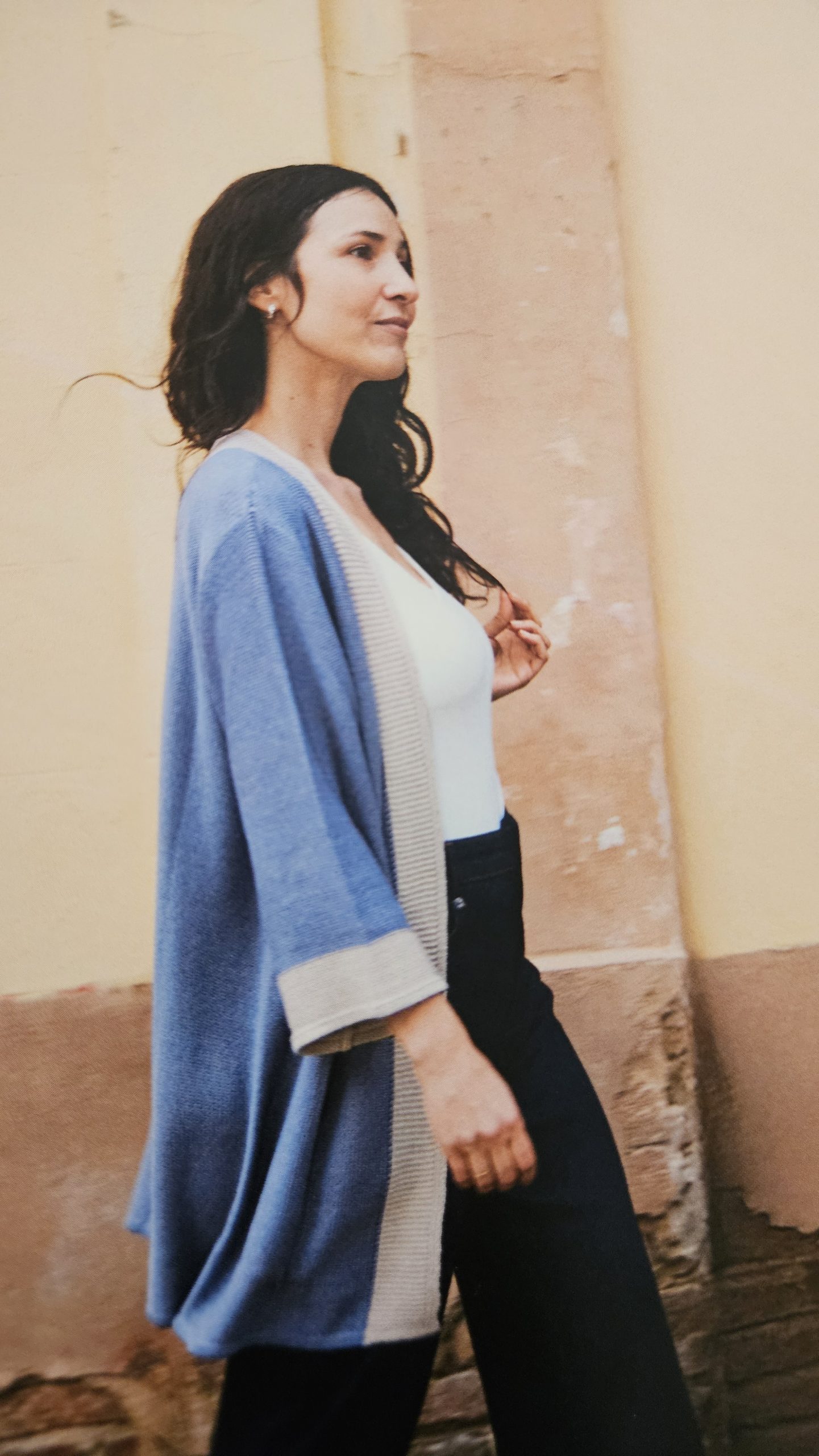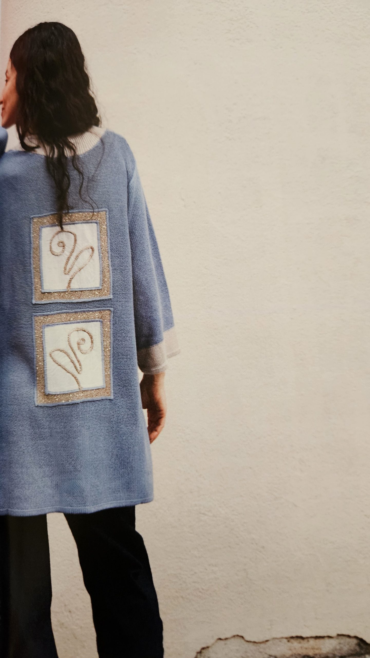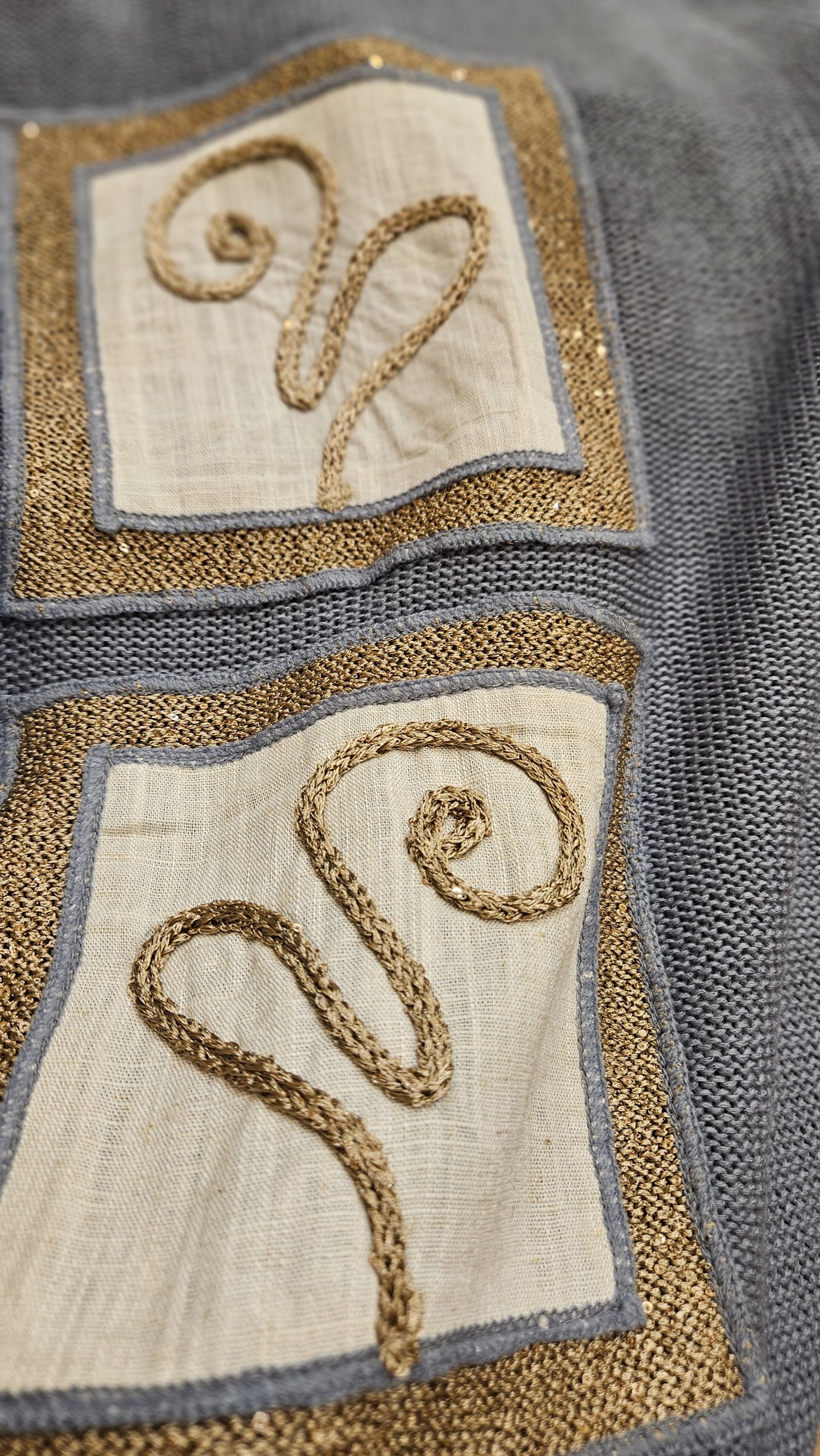Chaqueta larga y abierta de manga francesa, con bordados en la espalda en relieve y brillos dorados.