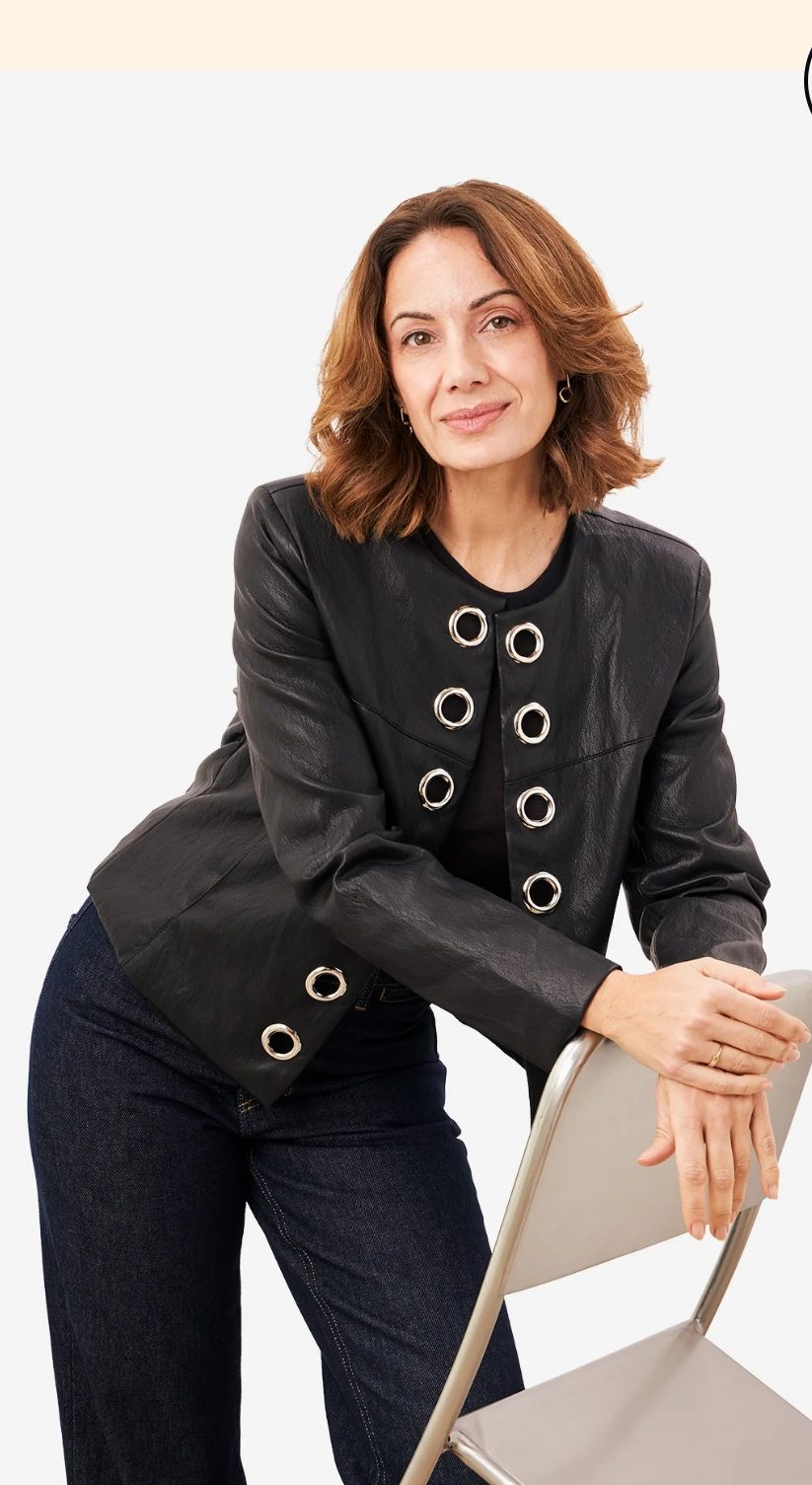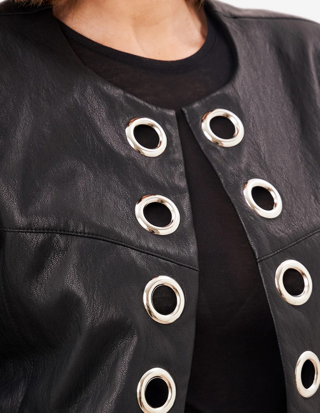 Preciosa chaqueta con forro interior , color negro .Bolsillos laterales y sin cierre delantero pero con arandelas plateadas como adorno.