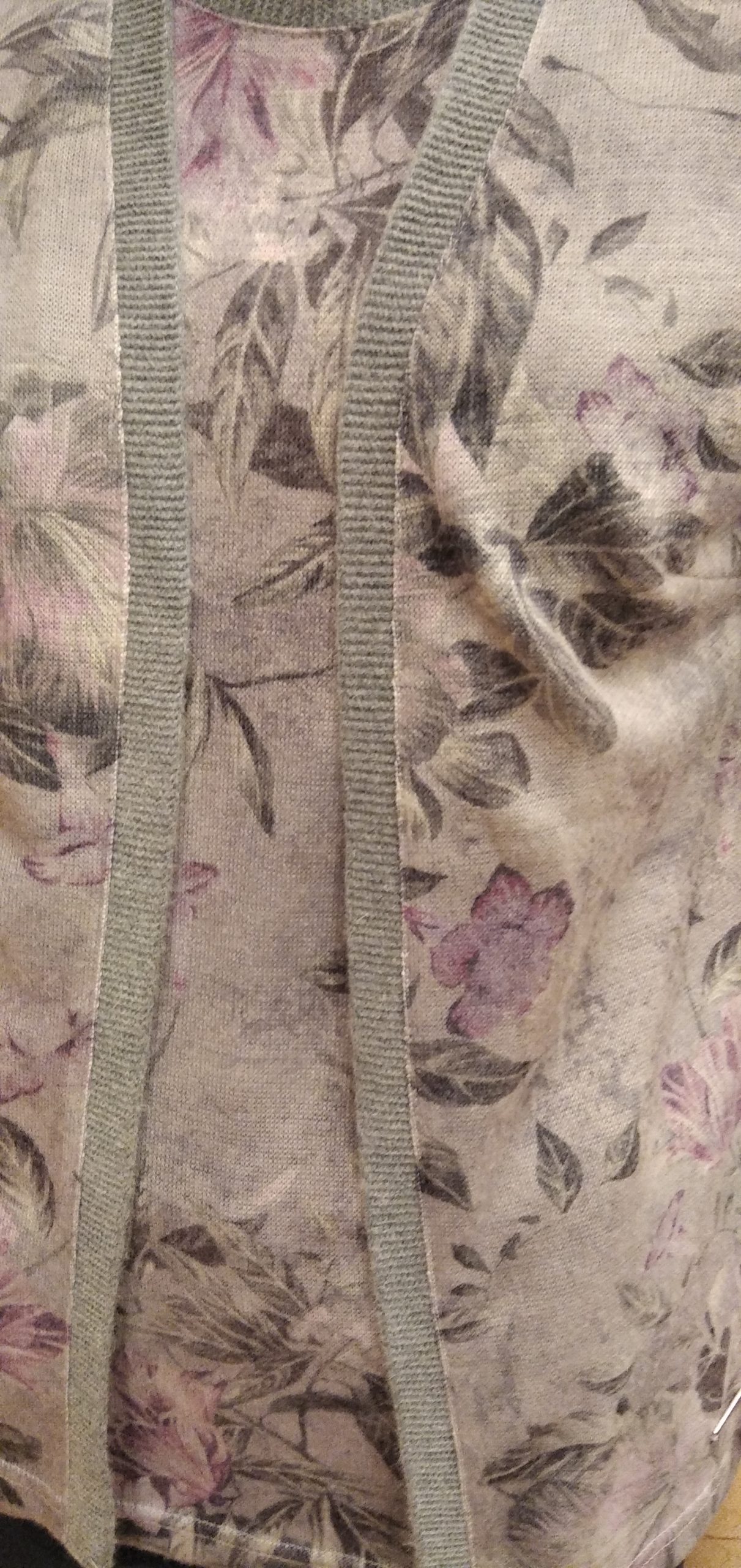 Falso twin-set con fondo gris y estampado de flores en tonos grises y rosas. Tiene cuello redondo y manga semi francesa.