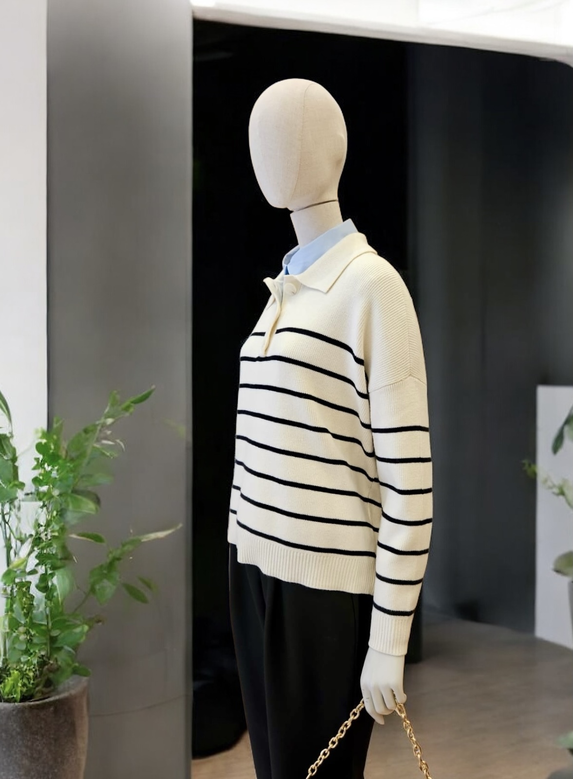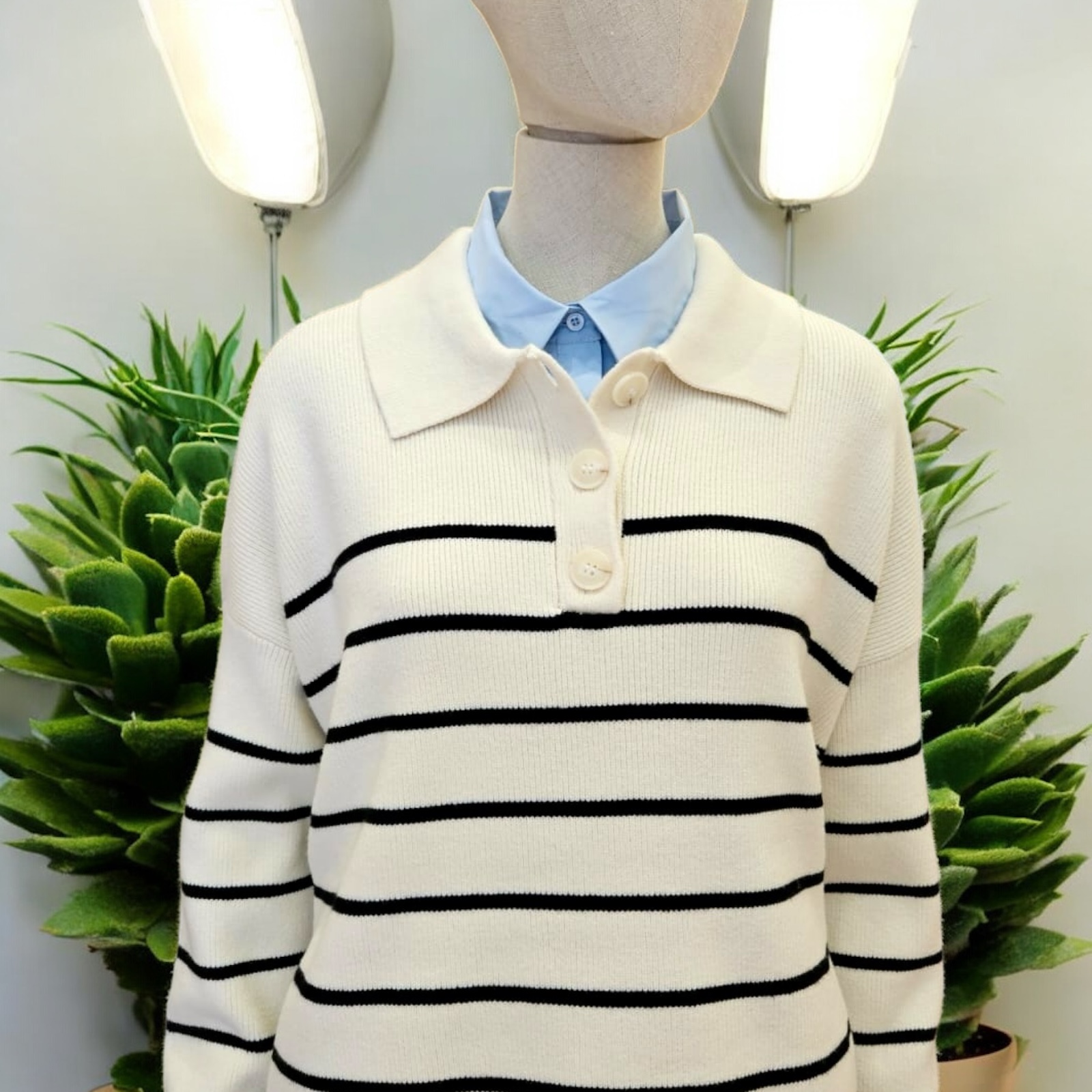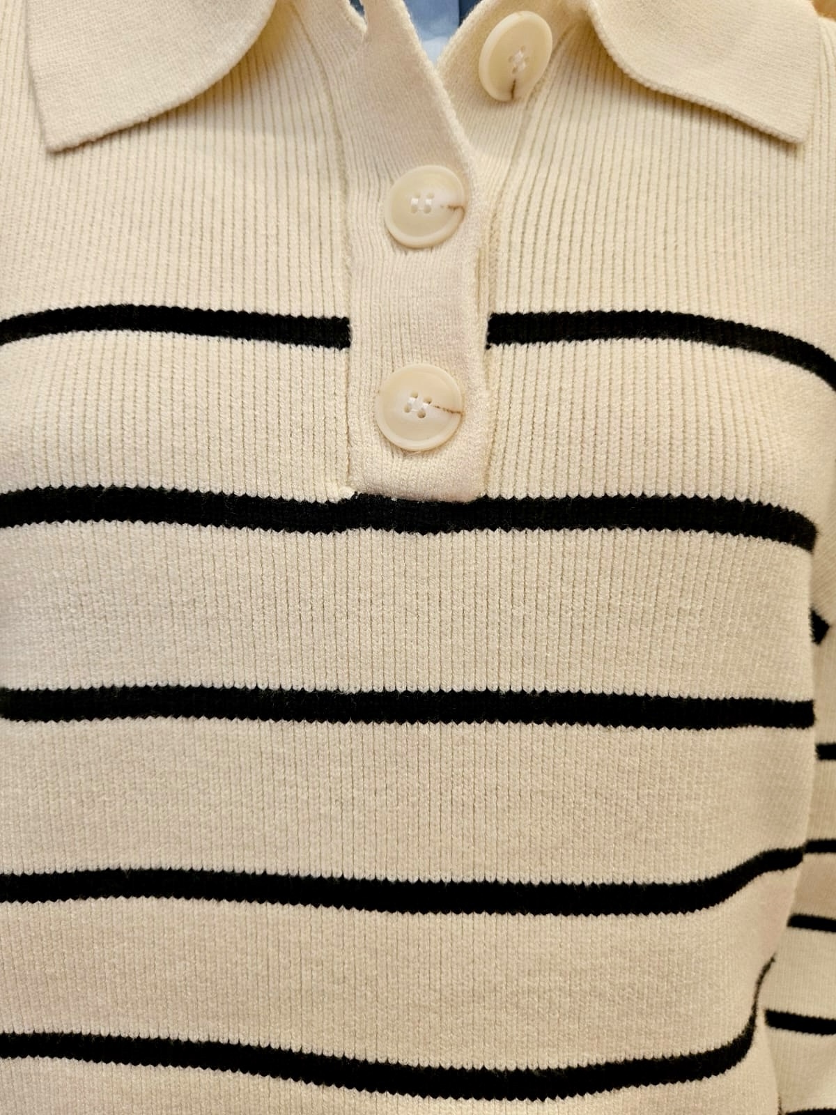 Jersey oversize beige con rayas horizontales negras y cuello camisero .