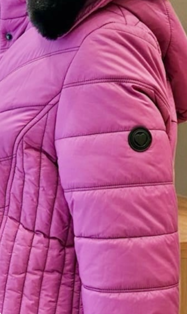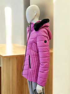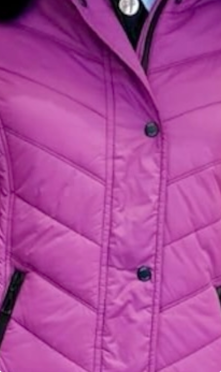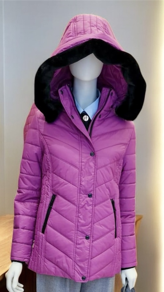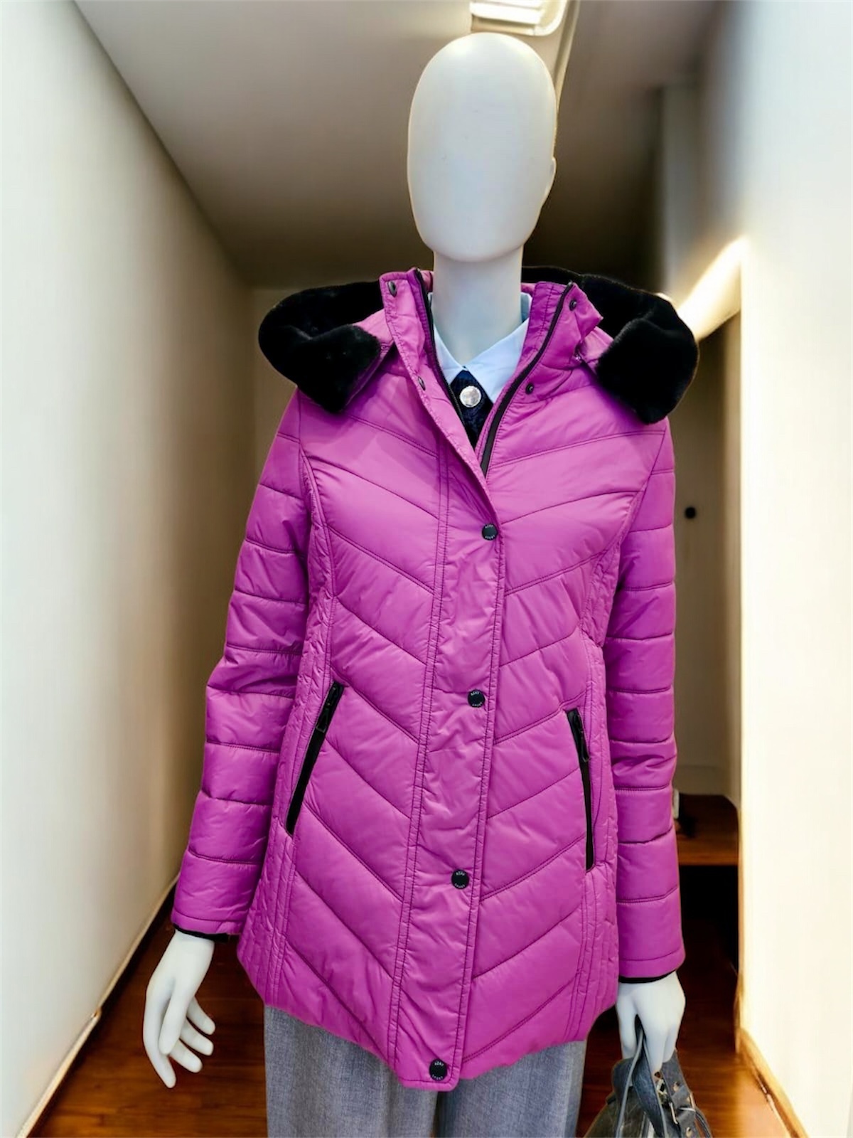 Parka acolchada color fucsia . Su diseño con costuras diagonales estiliza la silueta, mientras que la capucha ajustable y los bolsillos laterales con cremallera aportan practicidad.