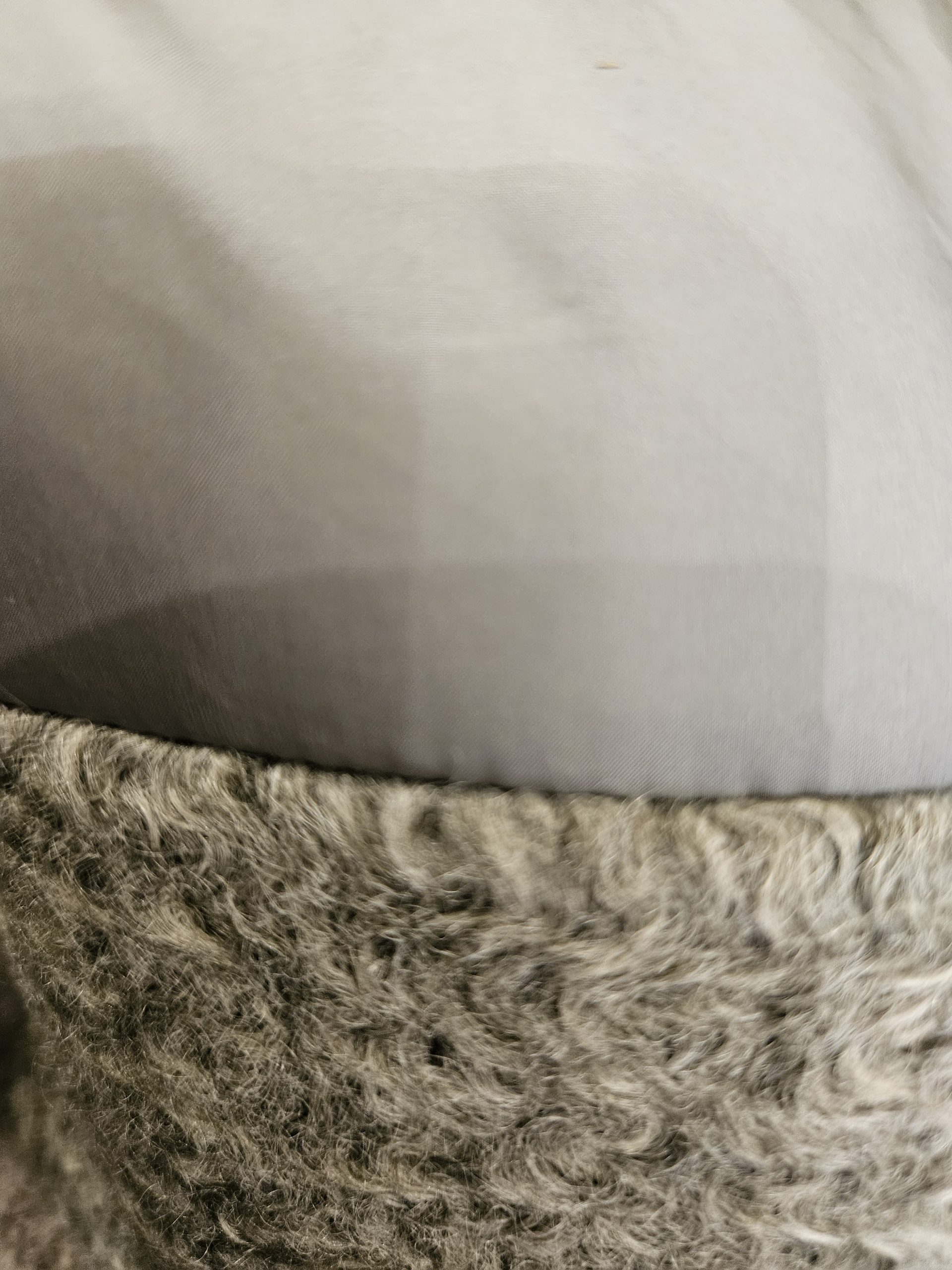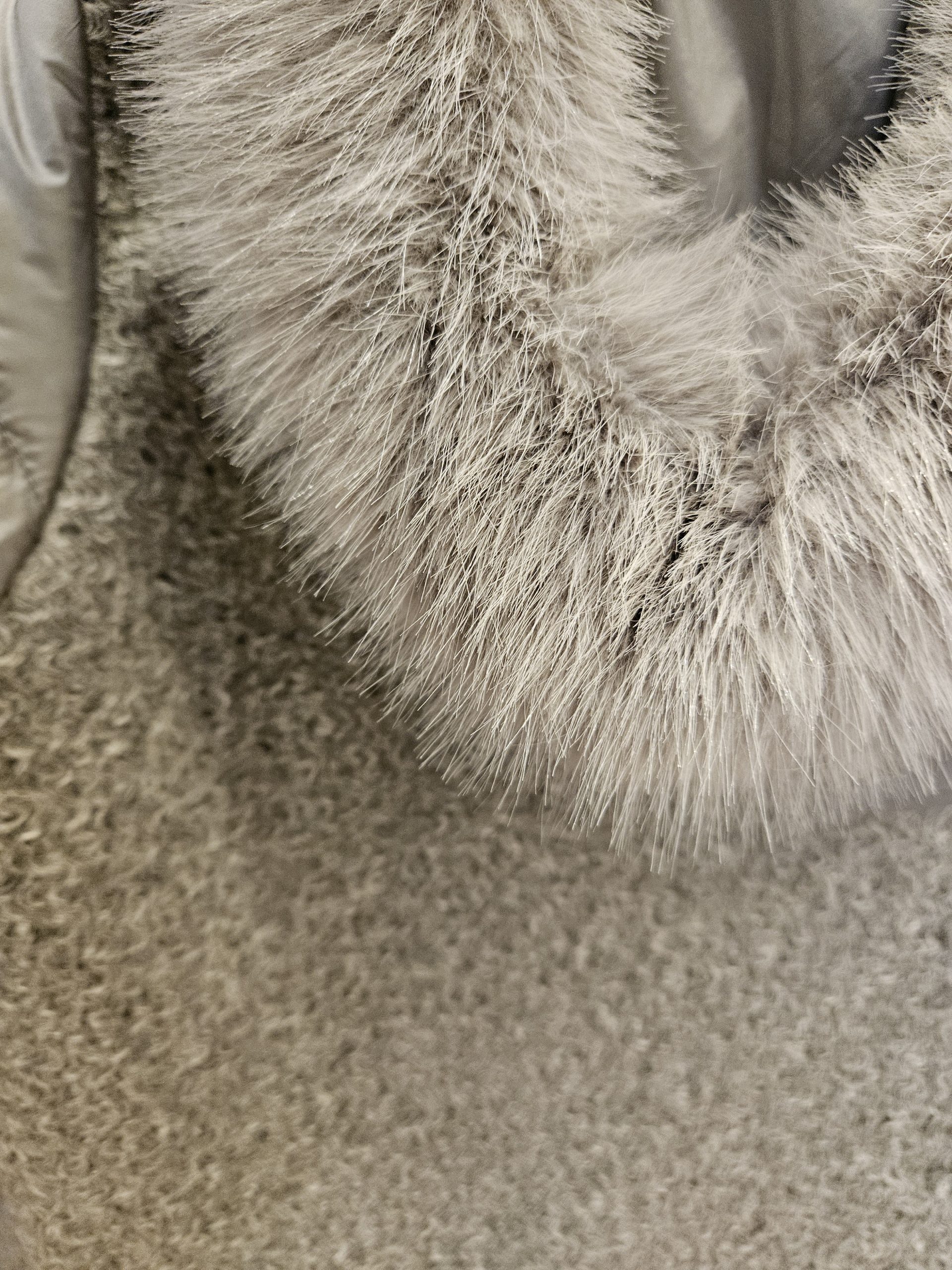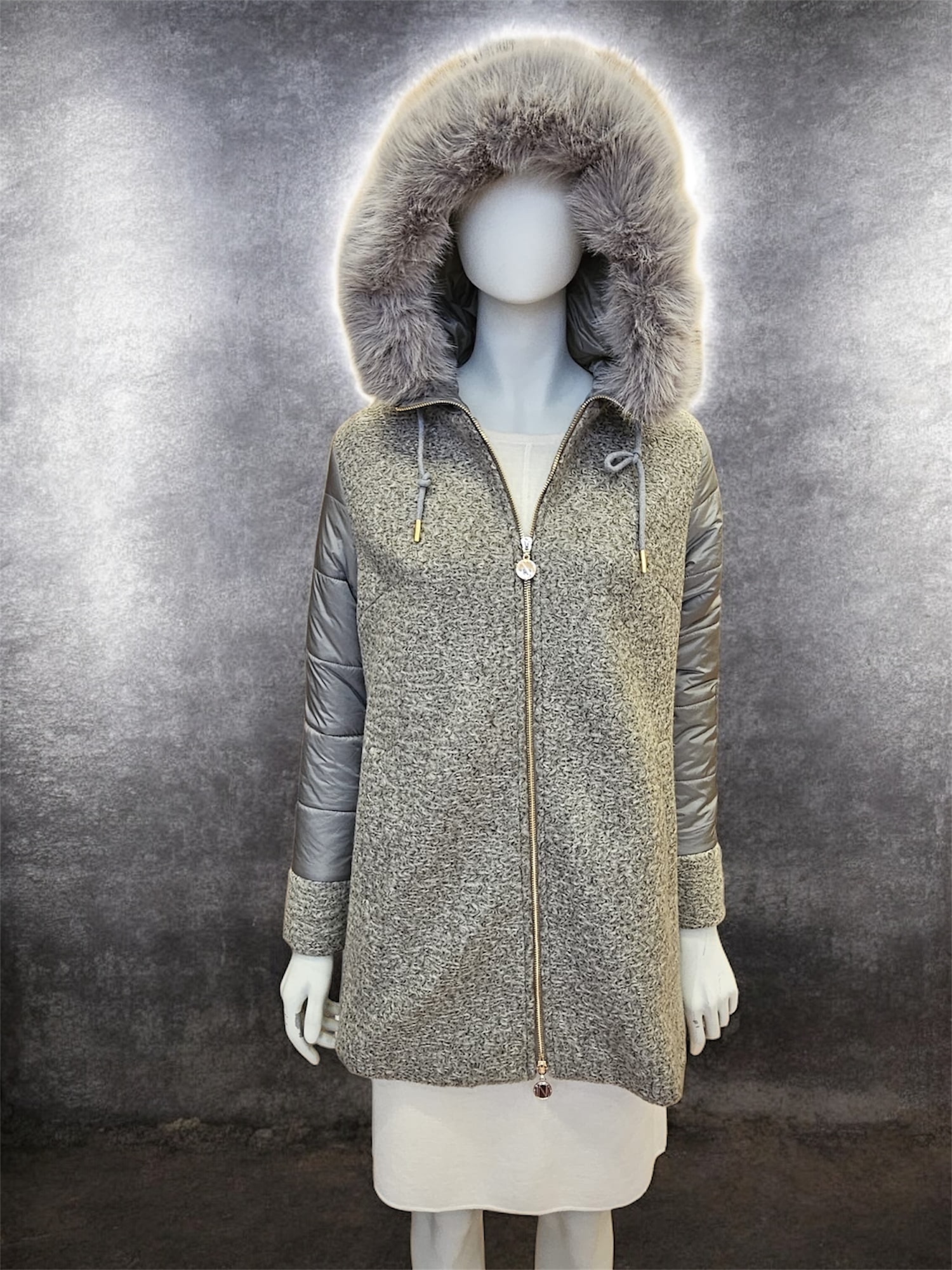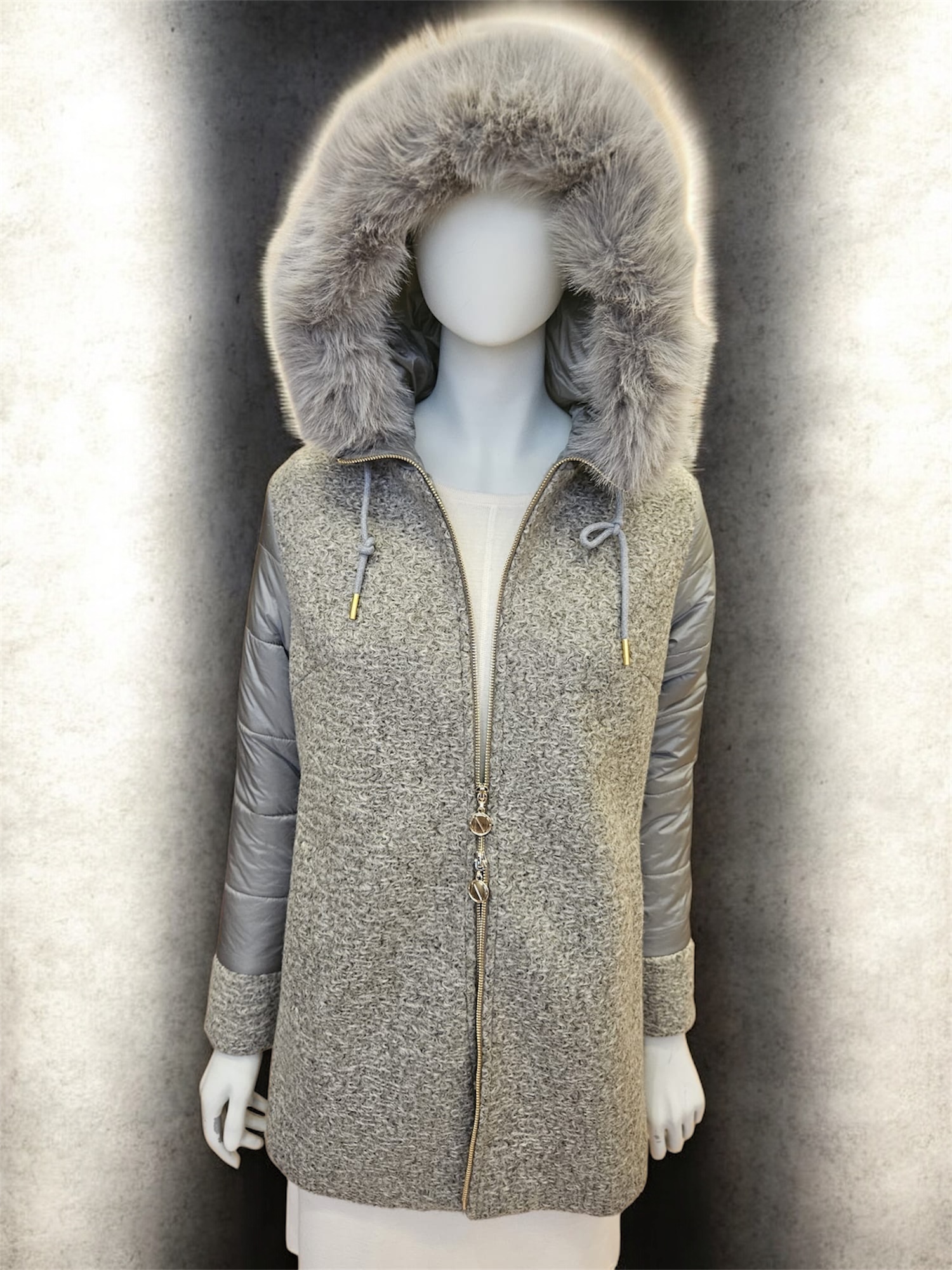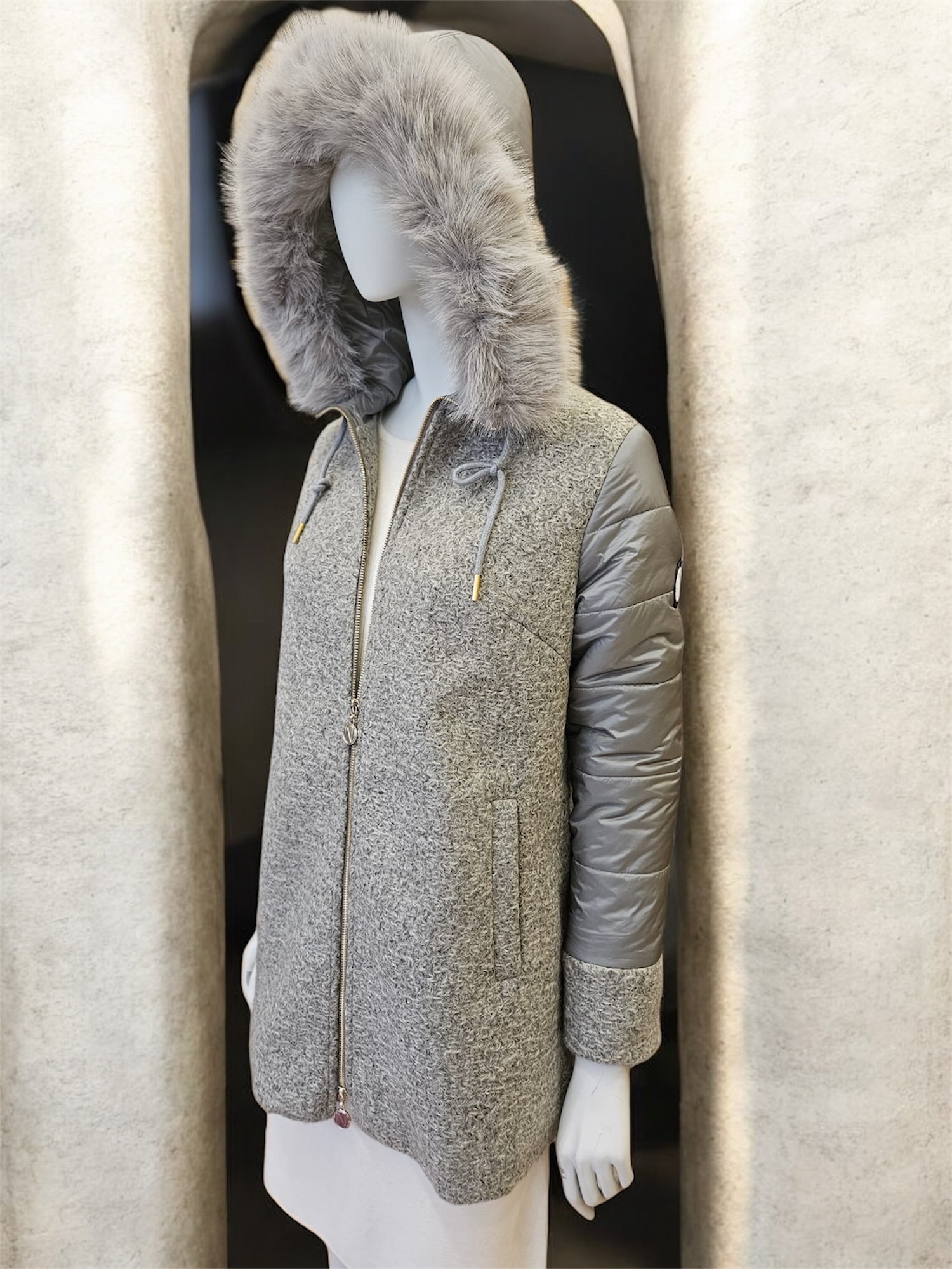 Parka gris con cuello de capucha ajustable y pelo desmontable, doble cremallera para ajustar la abertura . Moderna y calentita.