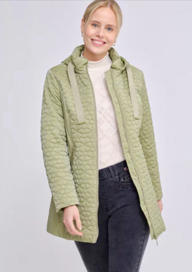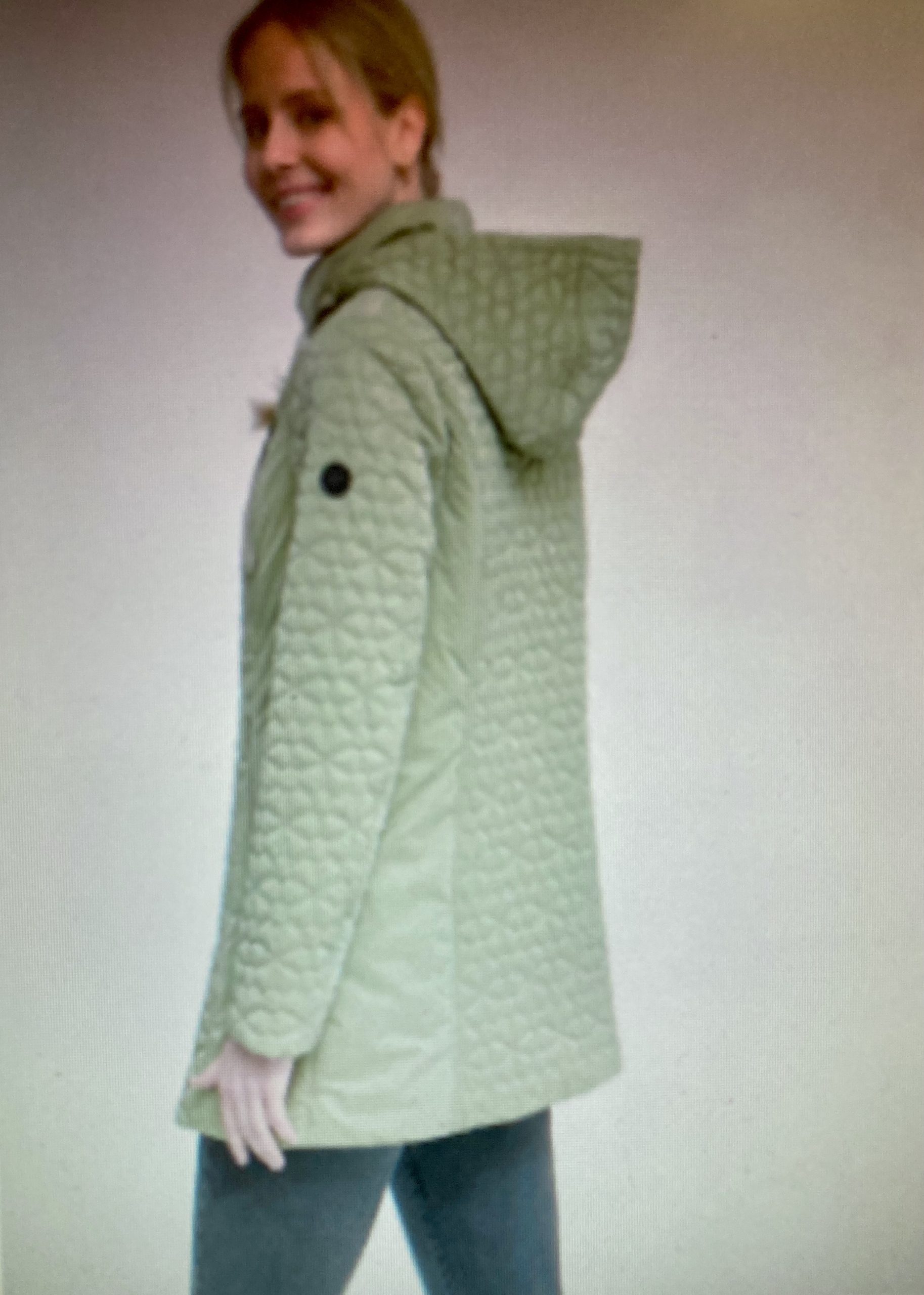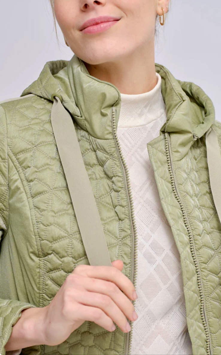 Parka acolchada color verde claro con diseño de pequeños rombos y cuello desmontable. Incorpora capucha con cordones anchos decorativos, cierre frontal con cremallera y bolsillos laterales prácticos