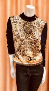 Suéter cuello perkins combinado punto con panós delantero raso. Botonas dorados en cuello y puños. Composición: 50% Viscosa, 50% Acrílico / 100% Poliéster. Lavado a mano.