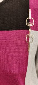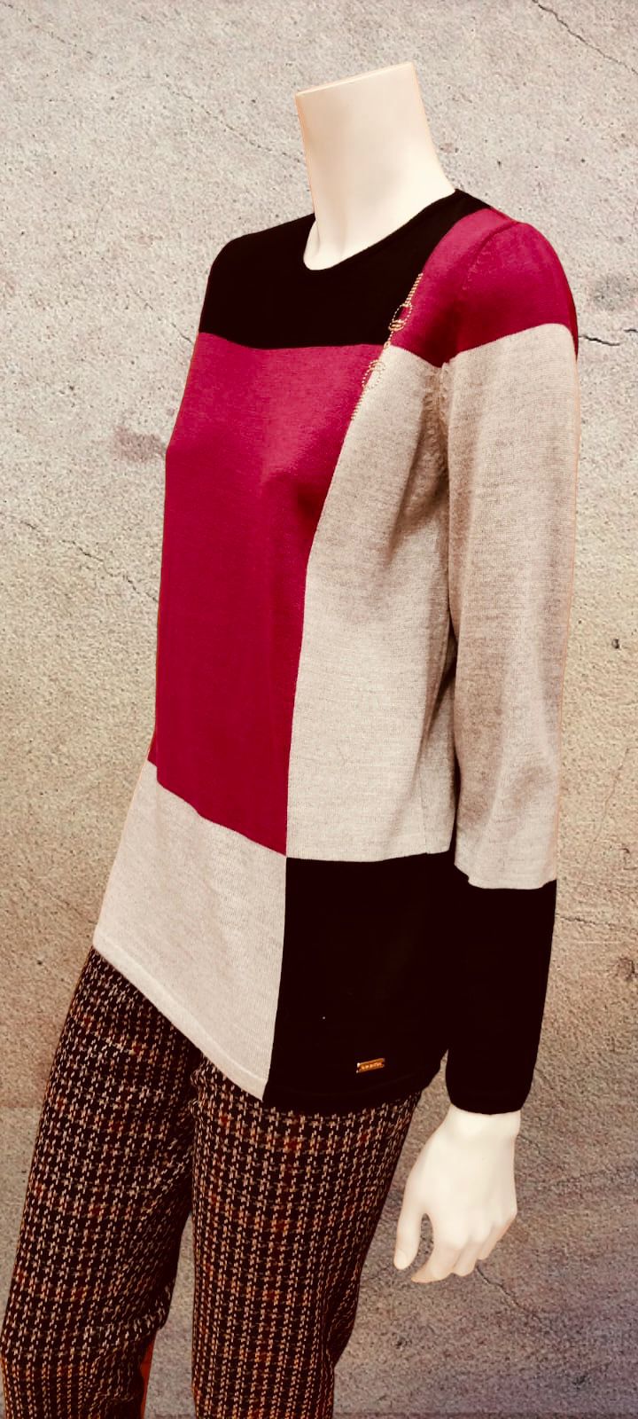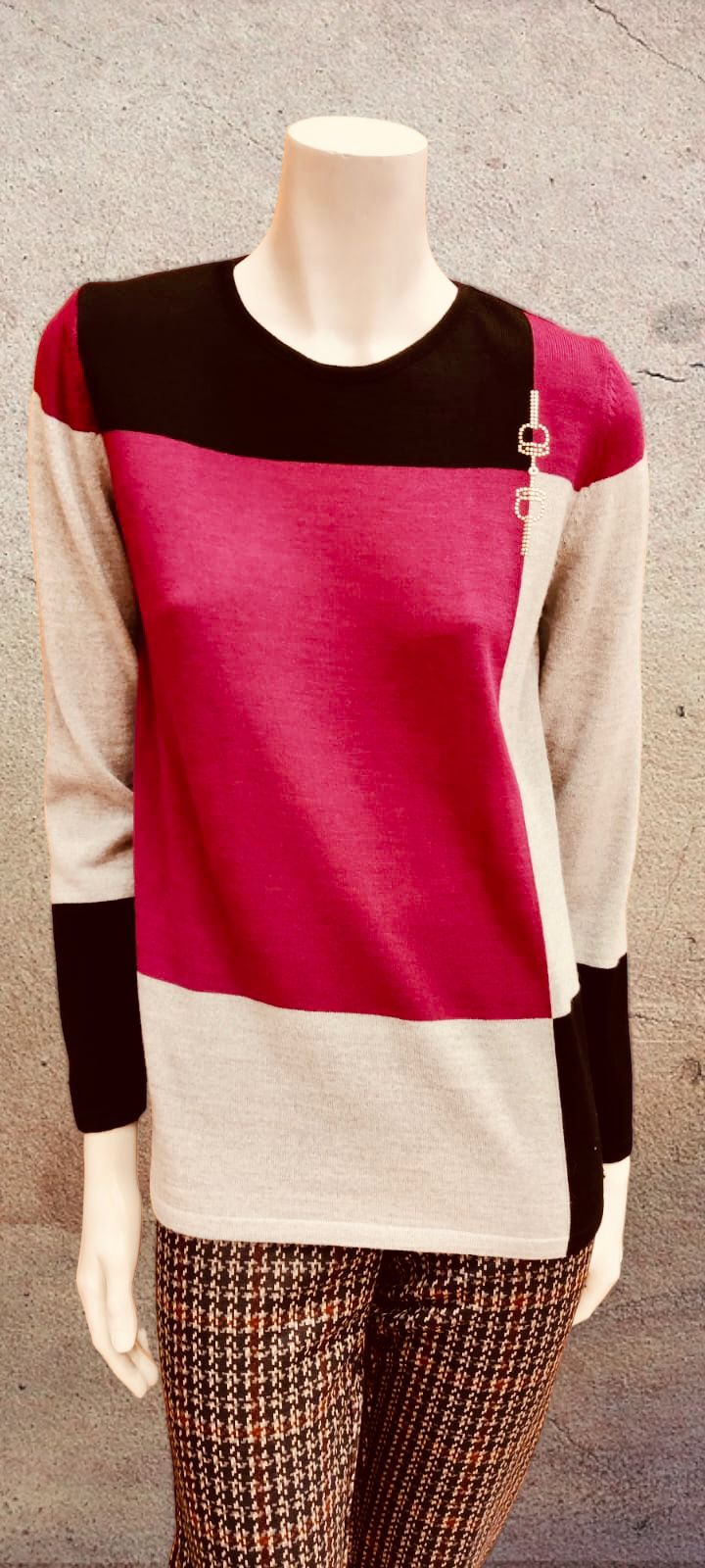 Suéter de lana merina a cuadros grises, morados y negros con adorno metálico en el pecho y hombreras. Composición: 50% Lana Merino, 50% Acrílico. Lavado a 40º.