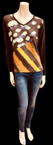 Suéter de pico estampado en pinceladas supersuave. Composición: 95% Poliéster, 5% Elastano / 80% Poliéster, 15% Rayón, 5% Elastómero. Lavar a 30º.