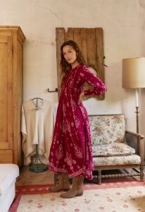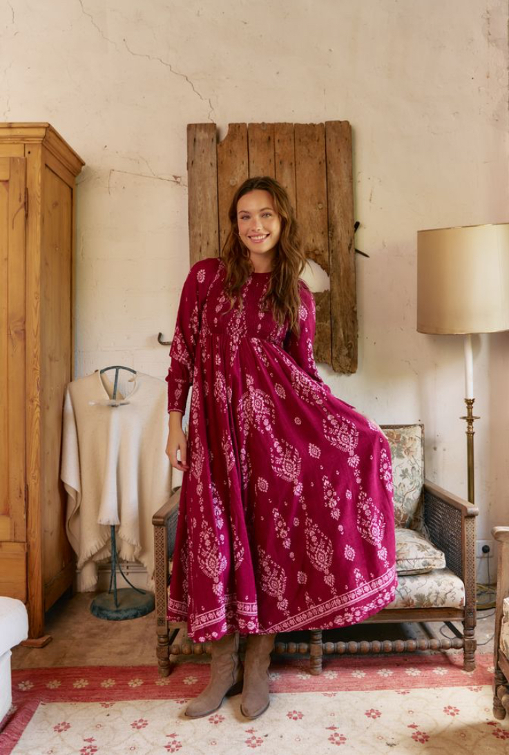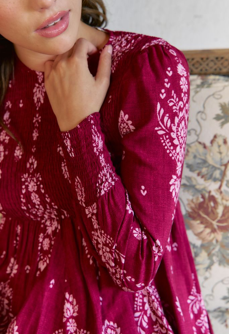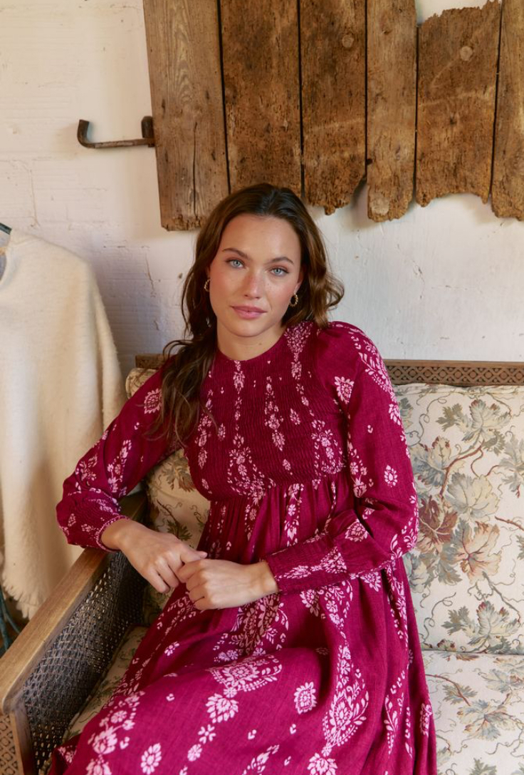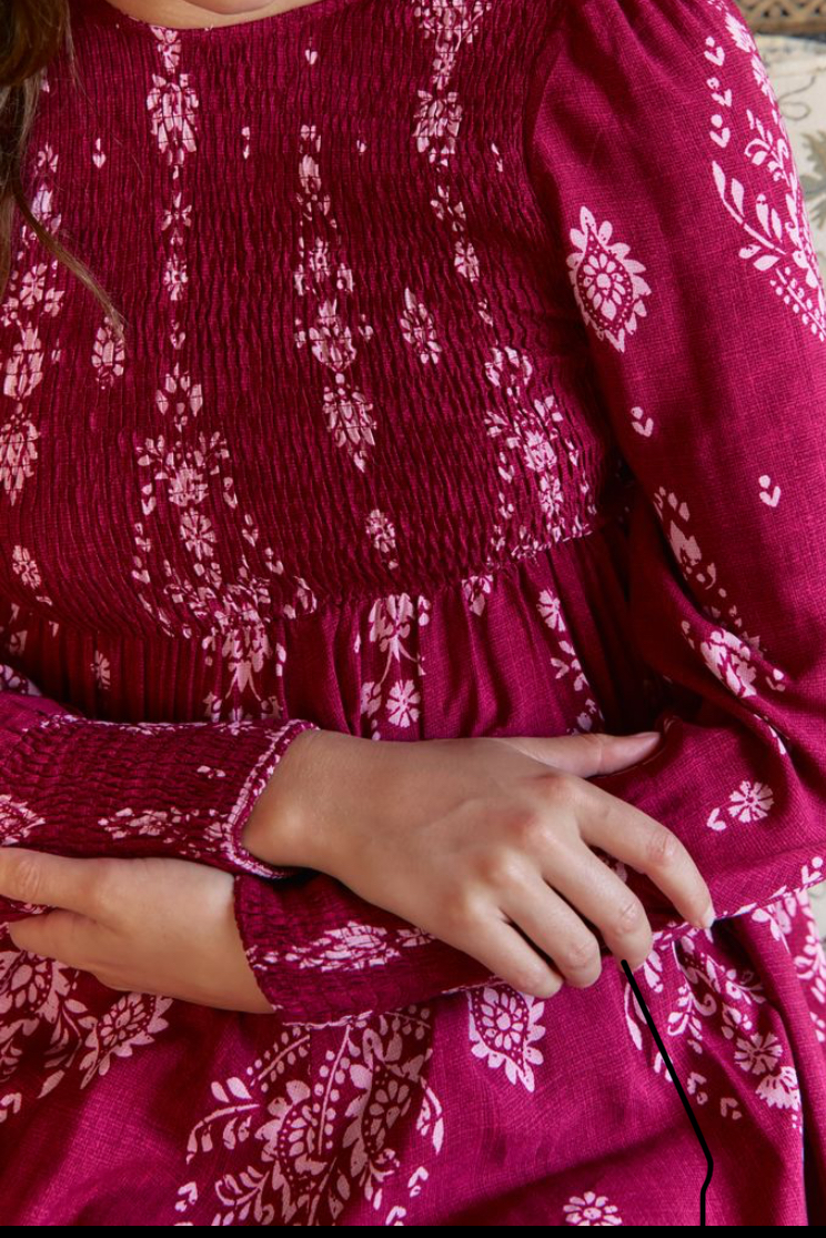 Maxivestido con estampado floral , corpiño fruncido y falda con detalles de pinzas. Tiene manga larga con puño elástico fruncido y se incluye la opción de lazo para la cintura.