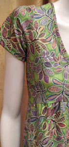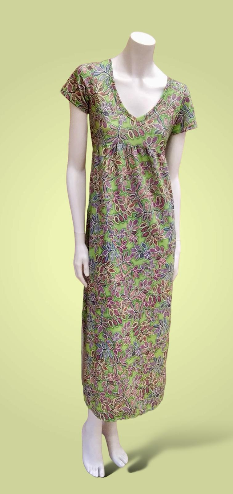 Vestido largo con corte imperio , escote en pico y manga corta. Con fondo color verde manzana y estampado de hojas.