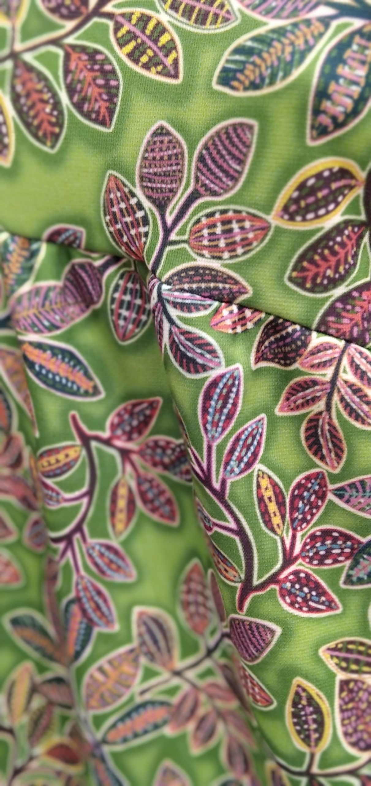 Vestido largo con corte imperio , escote en pico y manga corta. Con fondo color verde manzana y estampado de hojas. Tiene una abertura lateral.