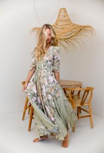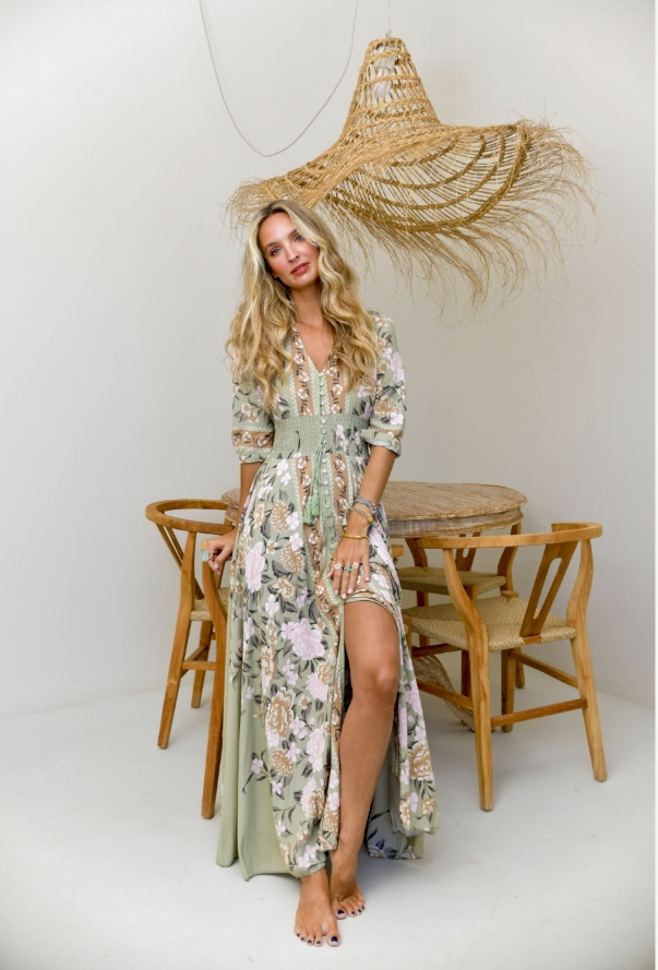Vestido estampado verde con frunce cintura manga francesa. Composición 100% rayón, lavar a mano con agua fria.