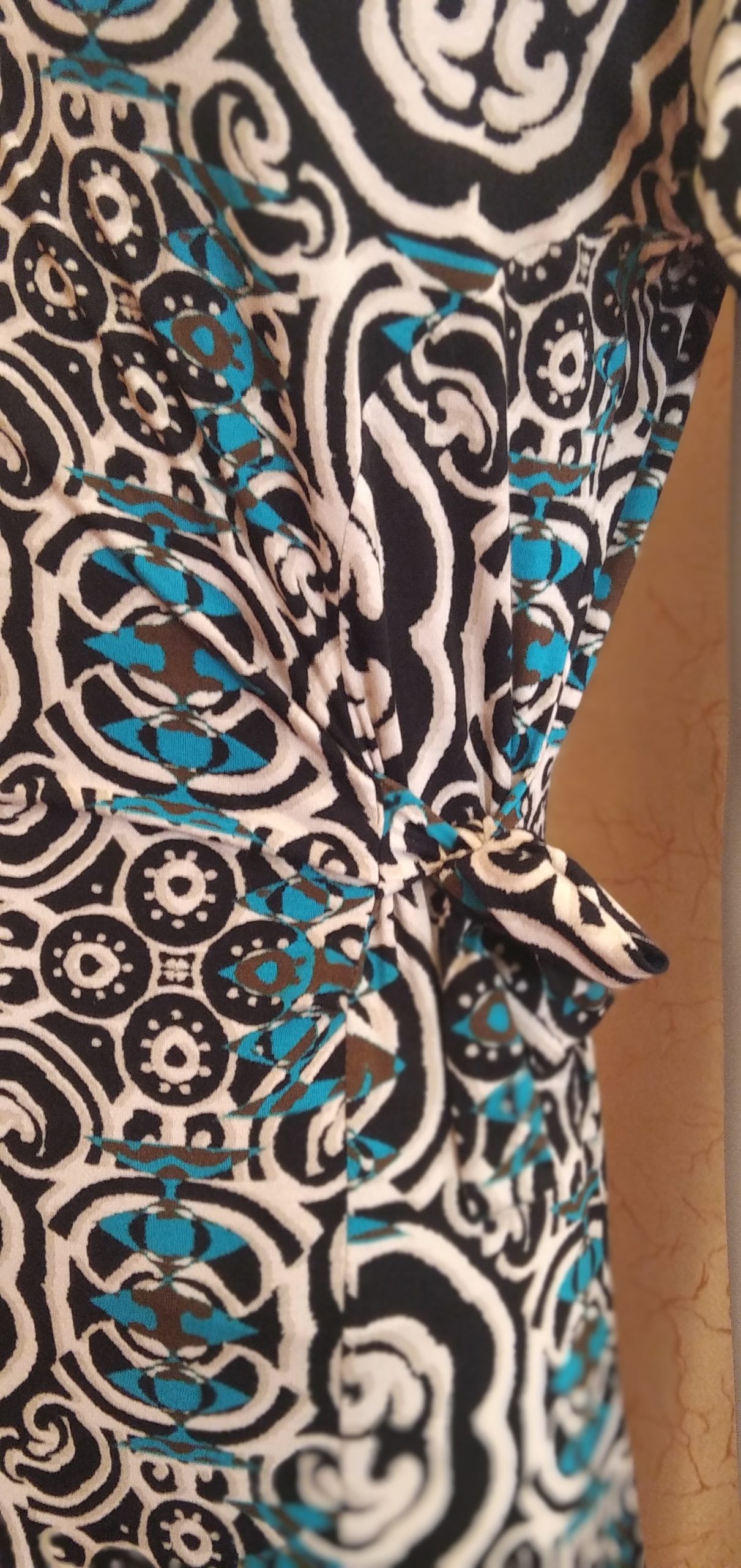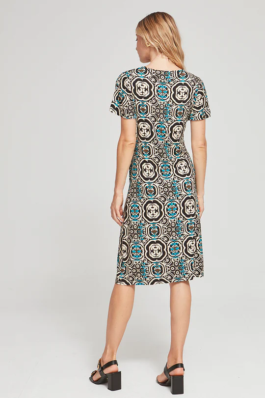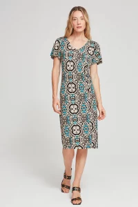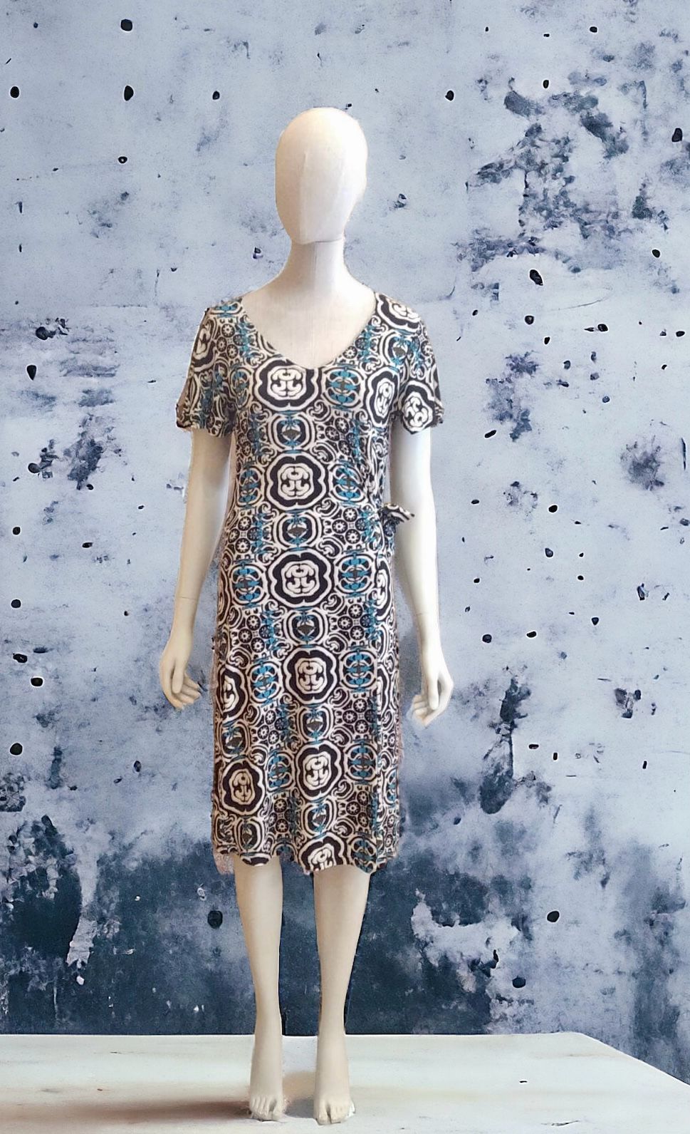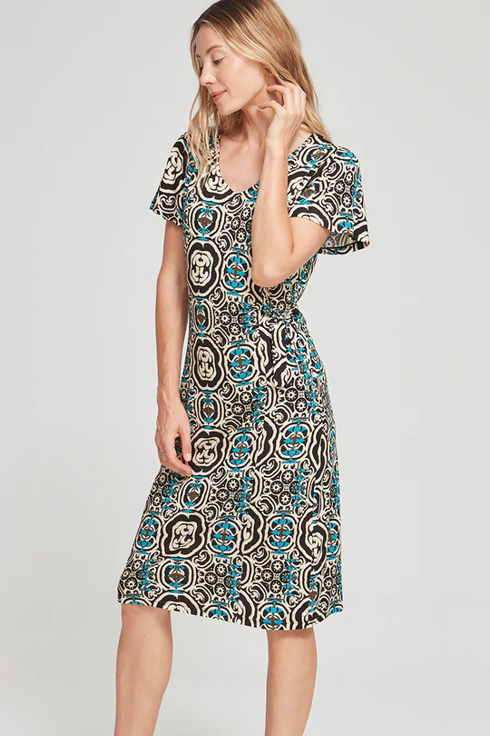 Vestido midi de cuello en pico ,manga campana corta y adorno de falso cinturón cruzado lateral.