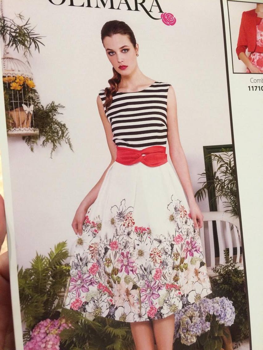Vestido compuesto por cuerpo sin mangas y cuello redondo a rayas blancas y negras horizontales, cinturón de tela rojo que se abotona atrás y falda midi abullonada con flores.